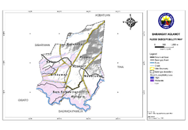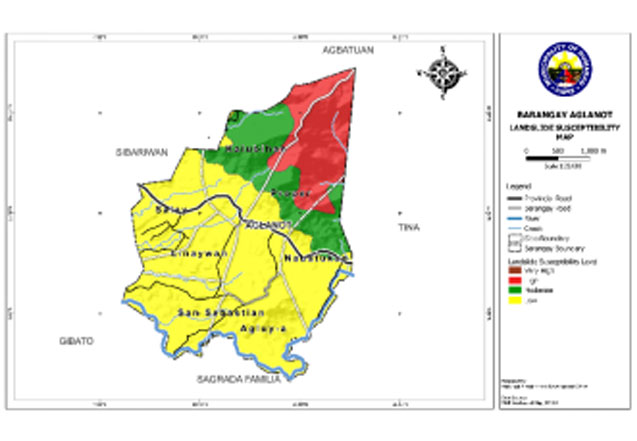 Aglanot is exposed to 2 types of hazards: rain-induced flooding with low susceptibility level, and rain-induced landslides with 3 susceptibility levels: high, moderate, and low.