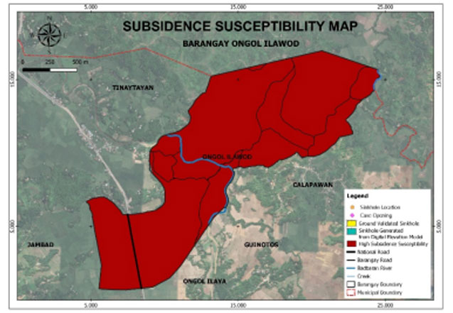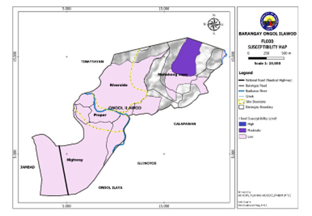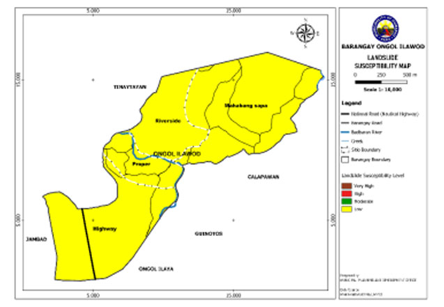 Ongol Ilawod is exposed to 3 types of hazards: rain-induced flooding with low susceptibility levels, rain-induced landslides with 3 susceptibility levels: high, moderate, and low, and KARST Subsidence.