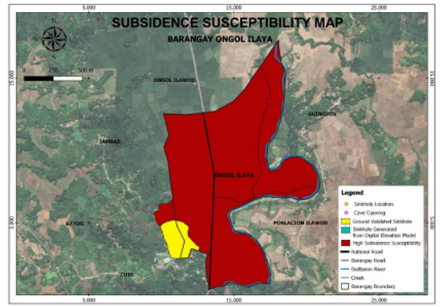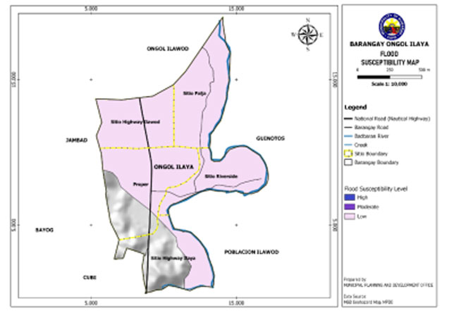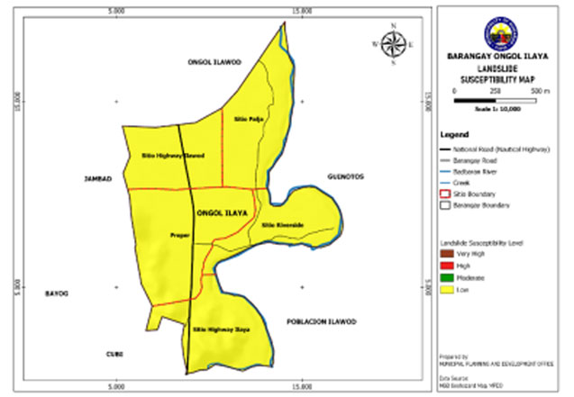 Ongol Ilaya is exposed to 3 types of hazards: rain-induced flooding with low susceptibility level, rain-induced landslides with low susceptibility level, and KARST Subsidence.