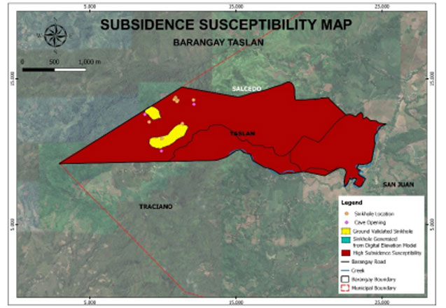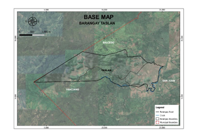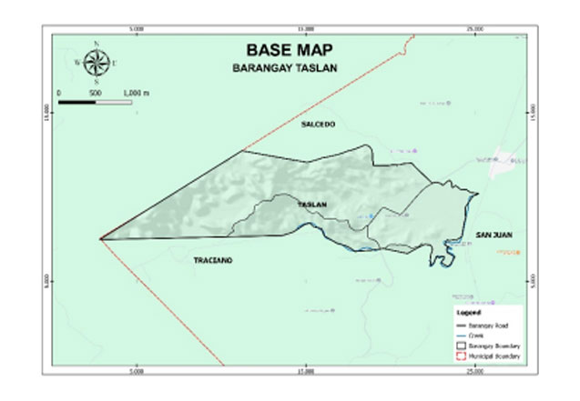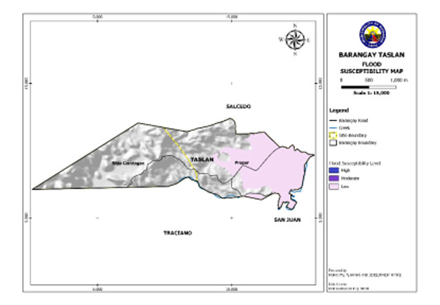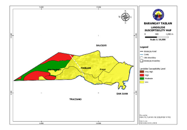 Taslan is exposed to 3 types of hazards: rain-induced flooding with low susceptibility levels, rain-induced landslides with 3 susceptibility levels: high, moderate, and low, and KARST Subsidence.